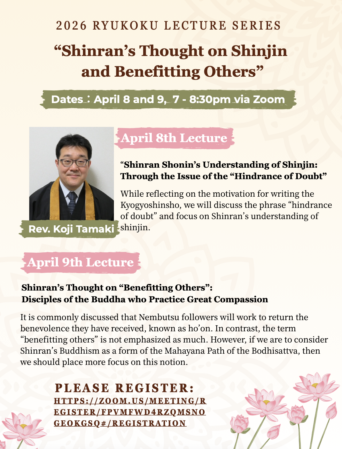 Please join us for the 2026 Ryukoku Lecture series to be held on Zoom on April 8 and 9, 7 - 8:30 p.m., Pacific Time Rev. Koji Tamaki of Ryukoku University Faculty of Letters, Department of Shin Buddhism April 8th […]