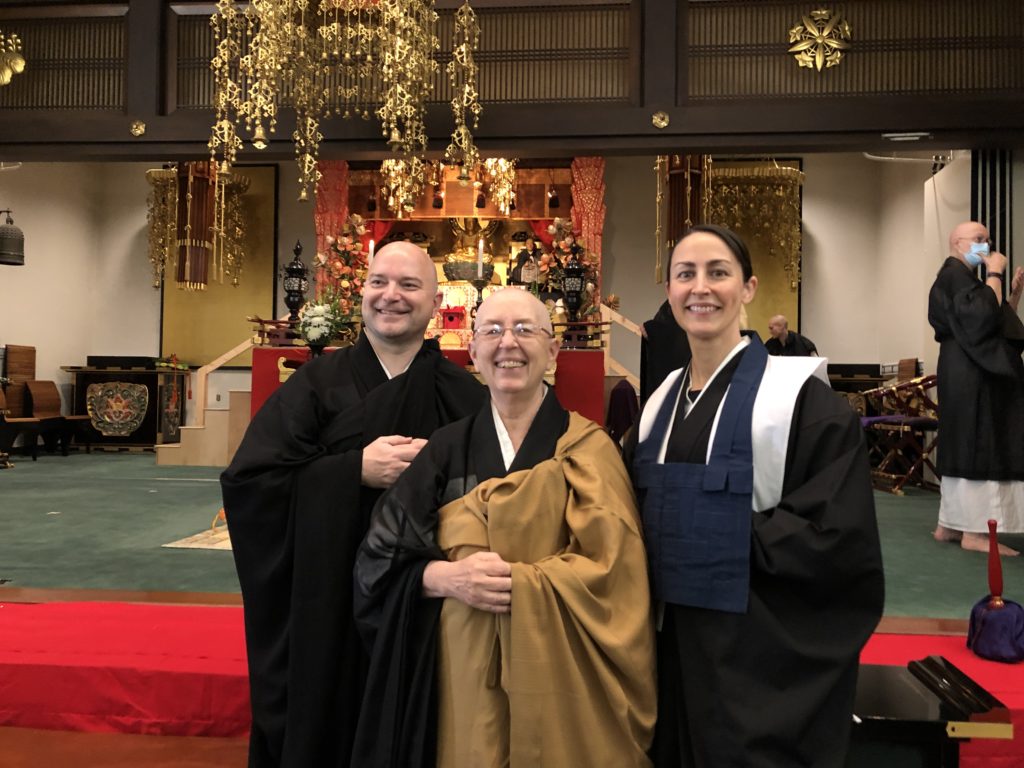 Rev. Bansho Green, Naomi Knoble, both students in our Certificate in Soto Zen Studies program, and faculty member Rev. Dr. Daijaku Kinst, participated in a Jukai-e ceremony at Zenshuji temple in Los Angeles from November 16-20. Naomi was one of nearly 100 people from around North America who took the Bodhisattva precepts during the event, and Bansho was the ritual attendant to Rev. Chozen Bays, one of the three main teachers in the ceremeonies. Rev. Dr. Kinst was an officiant.